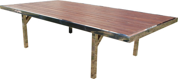 MESA EXTERIOR DE ACERO INOXIDABLE Y MADERAMesa para exterior fabricada con estructura de tubo de acero inoxidable con madera de pino teñida Teca y lacada. Medidas: 240 x 120 x 78 cms (imagen de muestra). Fabricamos a cualquier medida. Precio: A consultar según medidas y acabados. |