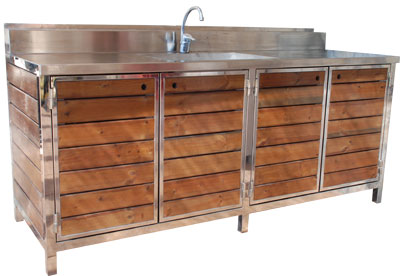 MUEBLE EXTERIOR DE ACERO INOXIDABLE Y MADERAMueble para exterior fabricado con estructura de tubo y sobre de acero inoxidable con madera de pino teñida Teca y lacada. Medidas: 200 x 70 x 90 cms (imagen de muestra). Fabricamos a cualquier medida. Precio: A consultar según medidas y acabados. |